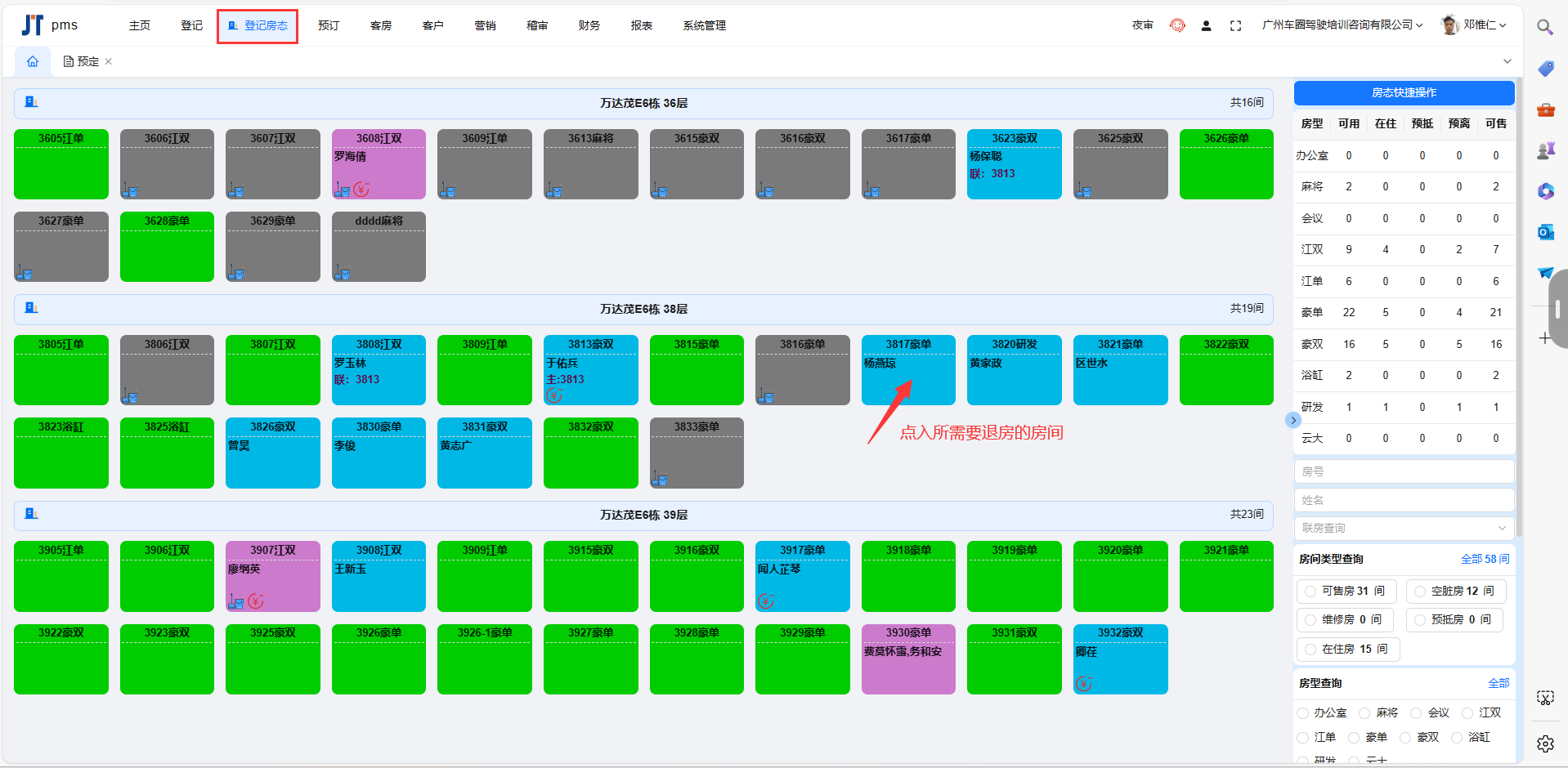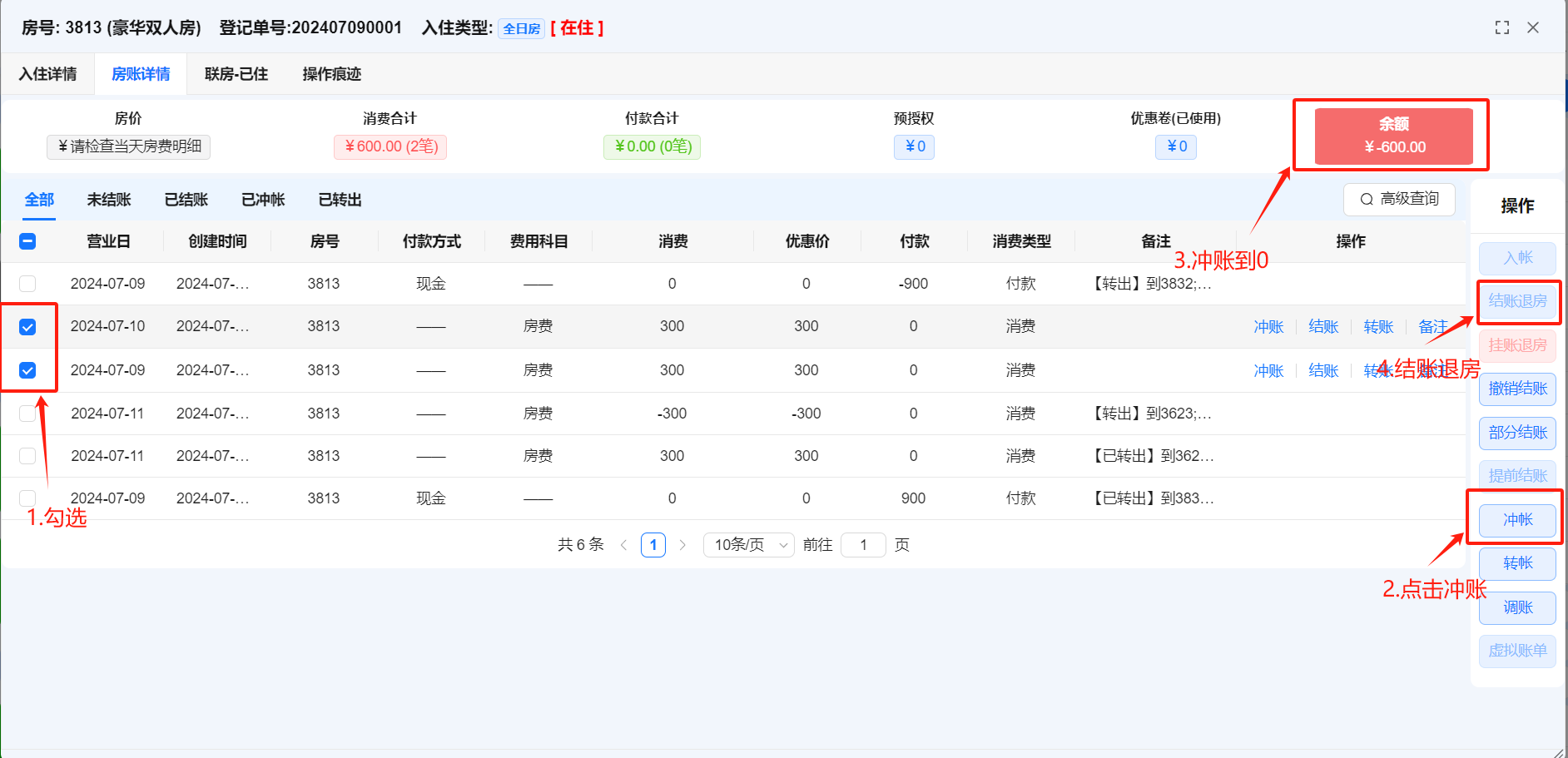 目录 搜索 业务操作基础数据支付设置微信支付登记中介开房散客开房会员开房协议单位开房退房续住部分结账结账退房退费办理会员入账(消费) 预付(付款)会员(新)联房旧系统功能办卡财务流水核销支付宝微信核销美团核销携程核销飞猪核销抖音核销京东核销内部核销说明核销结果说明前台业务办理规范系统文档主页更新日志集团平台实时房态便捷操作批改房态房间详情入住详情【续住】预订客房客户营销报表设置关于权限系统管理删除房间FAQ注册账号开通应用支付配置收款操作注意事项报表说明OTA单号常见问题远期房态排房交叉以及远期房量可售控制测试介绍酒店行业字典报表说明PC端报表小票打印机设置参考手机端报表出租情况运营报表 暂无相关搜索结果! 本文档使用 MinDoc 发布 退房 退房1.退房时点入客人所要退的房间2.勾选需冲账的消费进行冲账,看到余额冲账到0后选择结账退房再选择现金支付即可文档更新时间: 2025-03-14 17:04 作者:缪毅