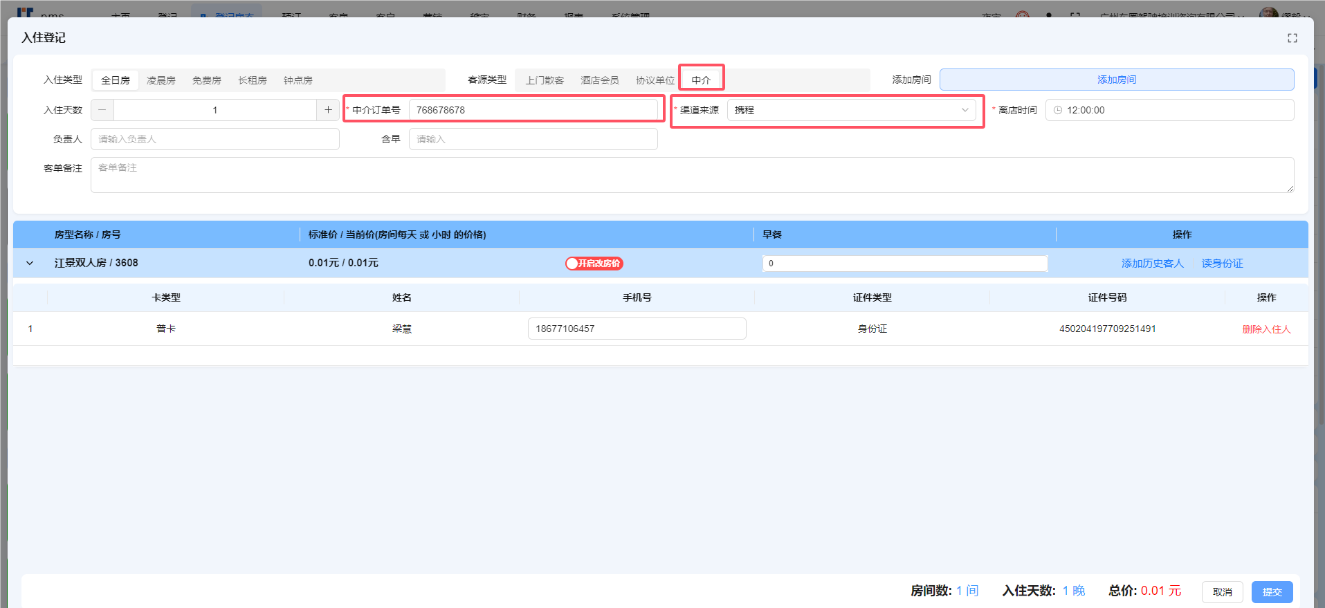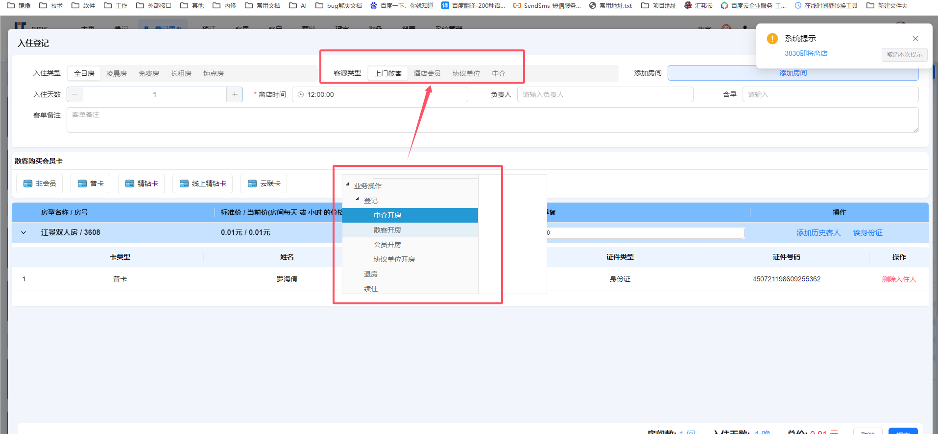 目录 搜索 业务操作基础数据支付设置微信支付登记中介开房散客开房会员开房协议单位开房退房续住部分结账结账退房退费办理会员入账(消费) 预付(付款)会员(新)联房旧系统功能办卡财务流水核销支付宝微信核销美团核销携程核销飞猪核销抖音核销京东核销内部核销说明核销结果说明前台业务办理规范系统文档主页更新日志集团平台实时房态便捷操作批改房态房间详情入住详情【续住】预订客房客户营销报表设置关于权限系统管理删除房间FAQ注册账号开通应用支付配置收款操作注意事项报表说明OTA单号常见问题远期房态排房交叉以及远期房量可售控制测试介绍酒店行业字典报表说明PC端报表小票打印机设置参考手机端报表出租情况运营报表 暂无相关搜索结果! 本文档使用 MinDoc 发布 中介开房 中介开房选择中介开房、填写订单号、选择订单平台后录入身份信息开房 文档更新时间: 2024-07-31 09:58 作者:缪毅