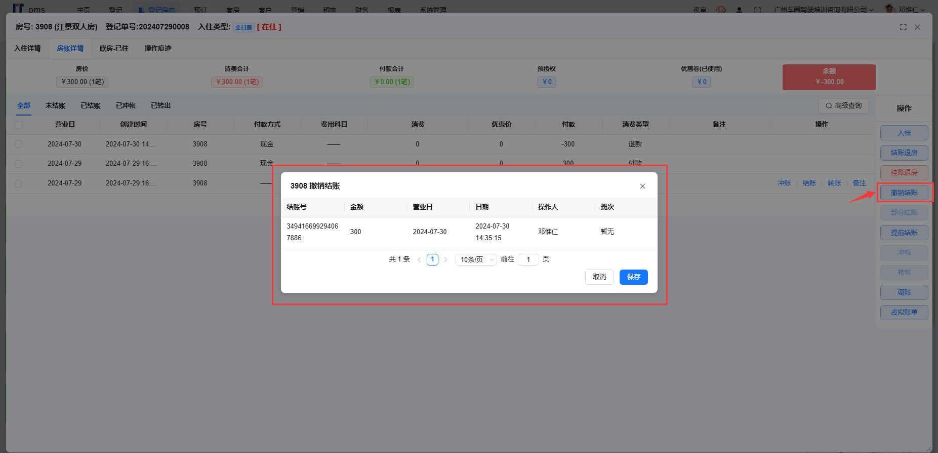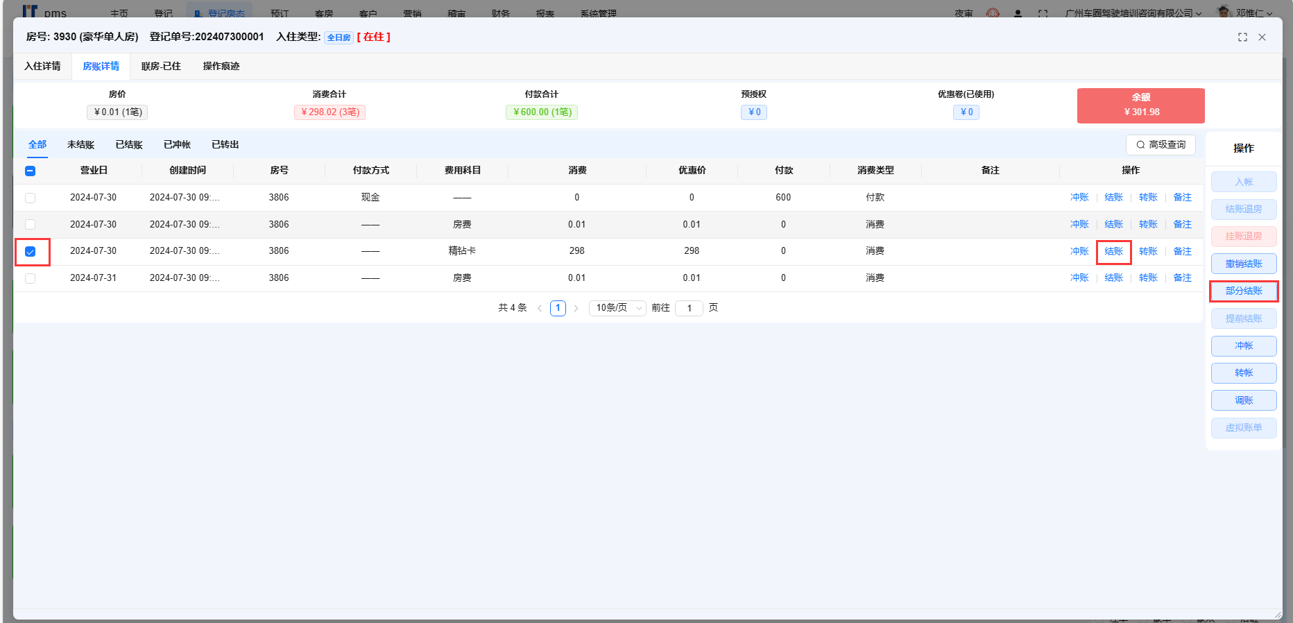 目录 搜索 业务操作基础数据支付设置微信支付登记中介开房散客开房会员开房协议单位开房退房续住部分结账结账退房退费办理会员入账(消费) 预付(付款)会员(新)联房旧系统功能办卡财务流水核销支付宝微信核销美团核销携程核销飞猪核销抖音核销京东核销内部核销说明核销结果说明前台业务办理规范系统文档主页更新日志集团平台实时房态便捷操作批改房态房间详情入住详情【续住】预订客房客户营销报表设置关于权限系统管理删除房间FAQ注册账号开通应用支付配置收款操作注意事项报表说明OTA单号常见问题远期房态排房交叉以及远期房量可售控制测试介绍酒店行业字典报表说明PC端报表小票打印机设置参考手机端报表出租情况运营报表 暂无相关搜索结果! 本文档使用 MinDoc 发布 部分结账 部分结账勾选所需要部分结账的项目后点击结账或者部分结账皆可部分结账 撤销结账部分结账后如需撤销结账可用文档更新时间: 2025-03-14 17:04 作者:邓惟仁