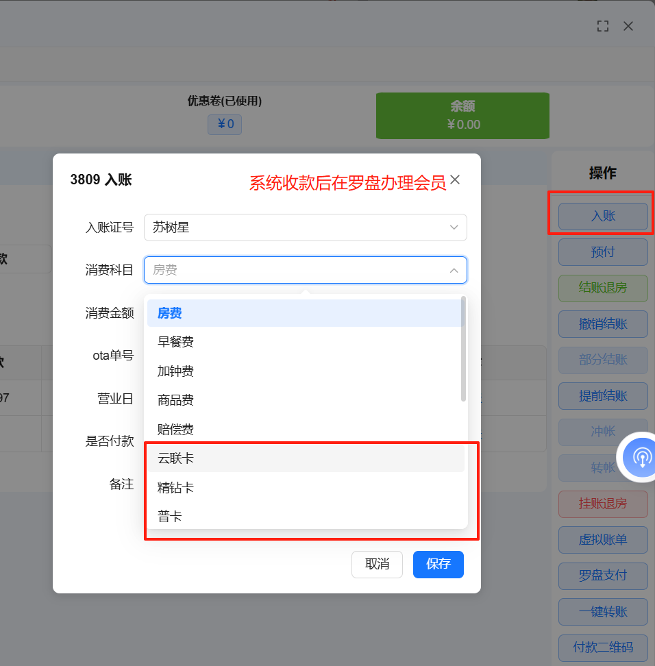 目录 搜索 业务操作基础数据支付设置微信支付登记中介开房散客开房会员开房协议单位开房退房续住部分结账结账退房退费办理会员入账(消费) 预付(付款)会员(新)联房旧系统功能办卡财务流水核销支付宝微信核销美团核销携程核销飞猪核销抖音核销京东核销内部核销说明核销结果说明前台业务办理规范系统文档主页更新日志集团平台实时房态便捷操作批改房态房间详情入住详情【续住】预订客房客户营销报表设置关于权限系统管理删除房间FAQ注册账号开通应用支付配置收款操作注意事项报表说明OTA单号常见问题远期房态排房交叉以及远期房量可售控制测试介绍酒店行业字典报表说明PC端报表小票打印机设置参考手机端报表出租情况运营报表 暂无相关搜索结果! 本文档使用 MinDoc 发布 办理会员 办理会员办理会员新系统只做收款业务,不做办卡业务。(办卡业务只在罗盘办理。)一,如客人需要办理会员,前台新系统房间里进行收款 二,罗盘办卡,不收款,不开房文档更新时间: 2025-08-13 12:04 作者:缪毅