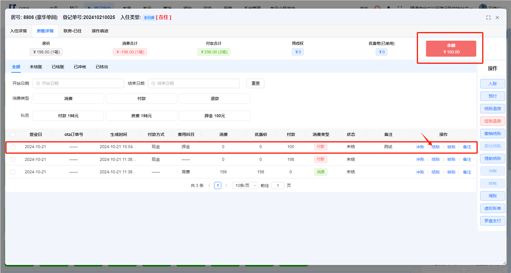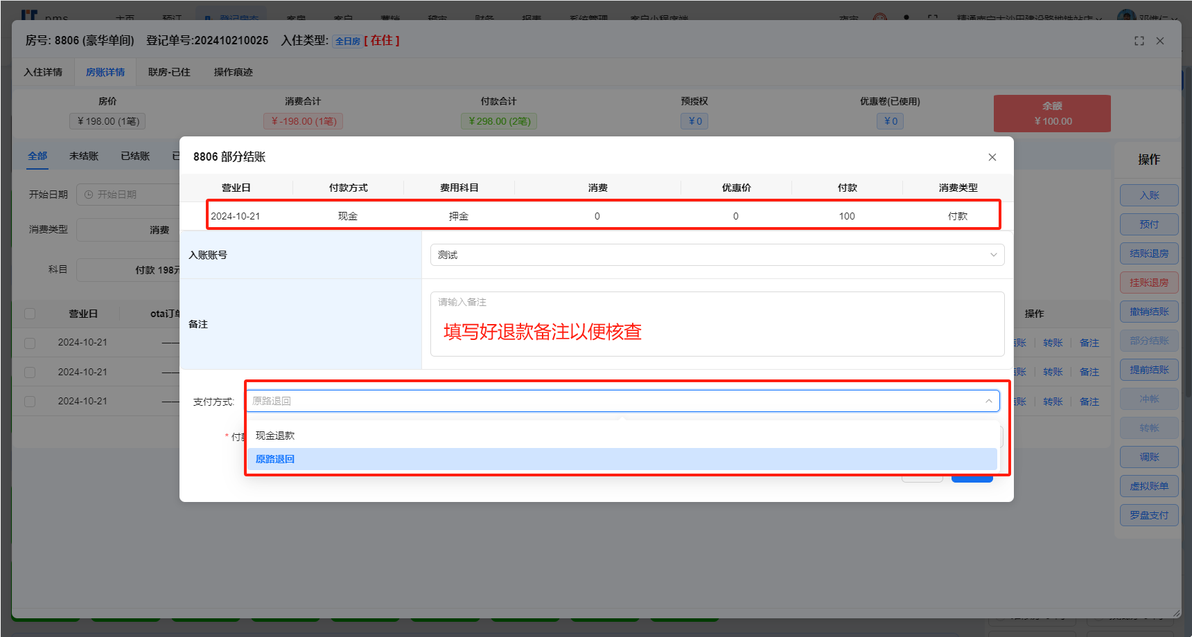 目录 搜索 业务操作基础数据支付设置微信支付登记中介开房散客开房会员开房协议单位开房退房续住部分结账结账退房退费办理会员入账(消费) 预付(付款)会员(新)联房旧系统功能办卡财务流水核销支付宝微信核销美团核销携程核销飞猪核销抖音核销京东核销内部核销说明核销结果说明前台业务办理规范系统文档主页更新日志集团平台实时房态便捷操作批改房态房间详情入住详情【续住】预订客房客户营销报表设置关于权限系统管理删除房间FAQ注册账号开通应用支付配置收款操作注意事项报表说明OTA单号常见问题远期房态排房交叉以及远期房量可售控制测试介绍酒店行业字典报表说明PC端报表小票打印机设置参考手机端报表出租情况运营报表 暂无相关搜索结果! 本文档使用 MinDoc 发布 退费 退费如图显示房间存在有余额需要退款给客人的,选中需要退款的账单点击结账选择现金或者原路退回文档更新时间: 2025-03-14 17:04 作者:梁致康