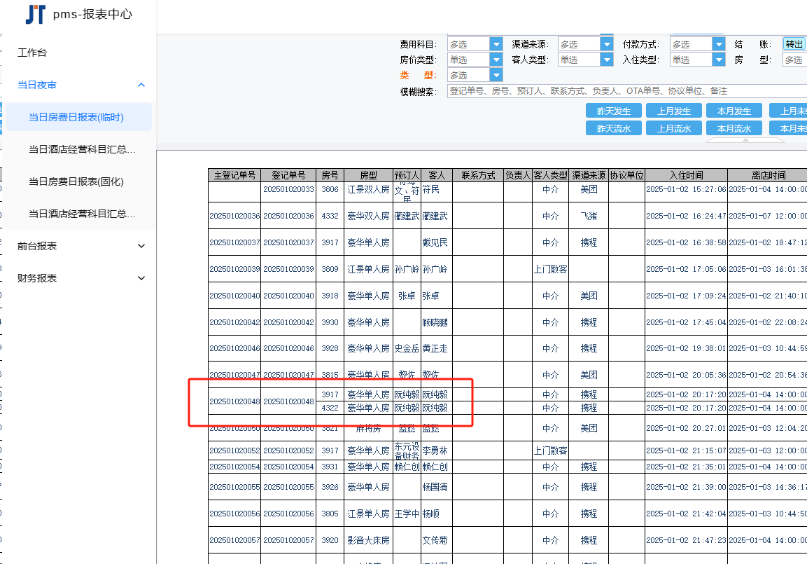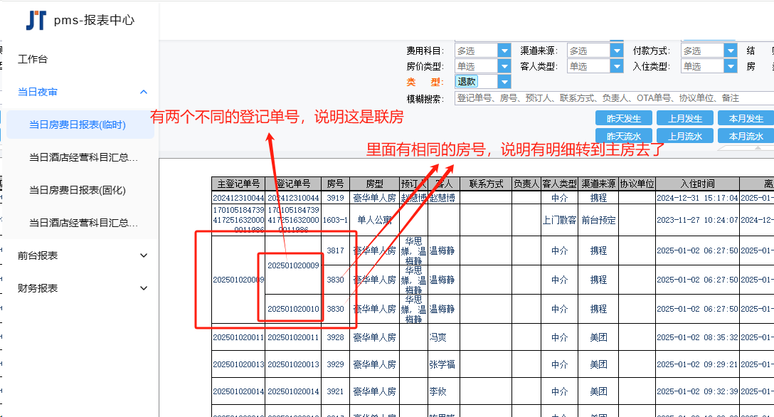 从下面的图中可以看到,3817这个房间的登记单号是202501020009,并且主登记单号也是202501020009,说明主房的登记单号和3817相同,那这个3817就是主房了。