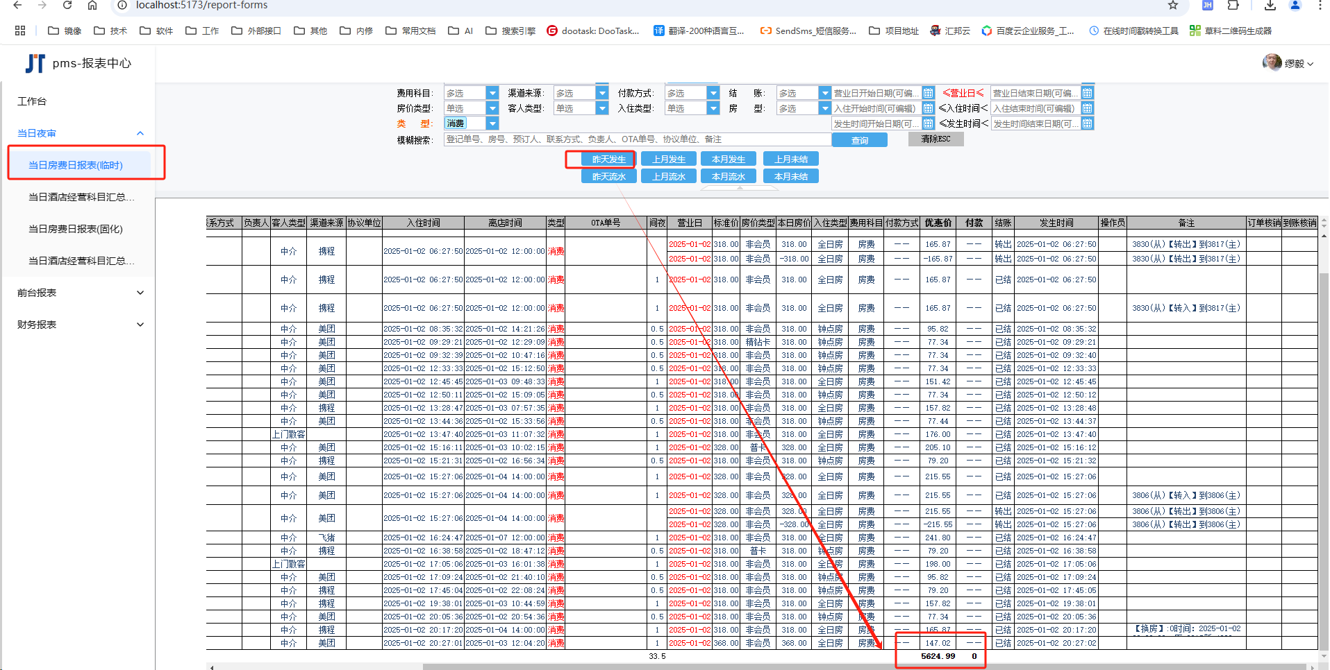 昨天营收是指昨天这个营业日内,一共需要收取客人多少费用,或者说昨天这个营业日内整个这个酒店的营业收入。如图所示,点击【昨天发生】之后得到的报表就是昨天这个营业日内的所有费用的发生。