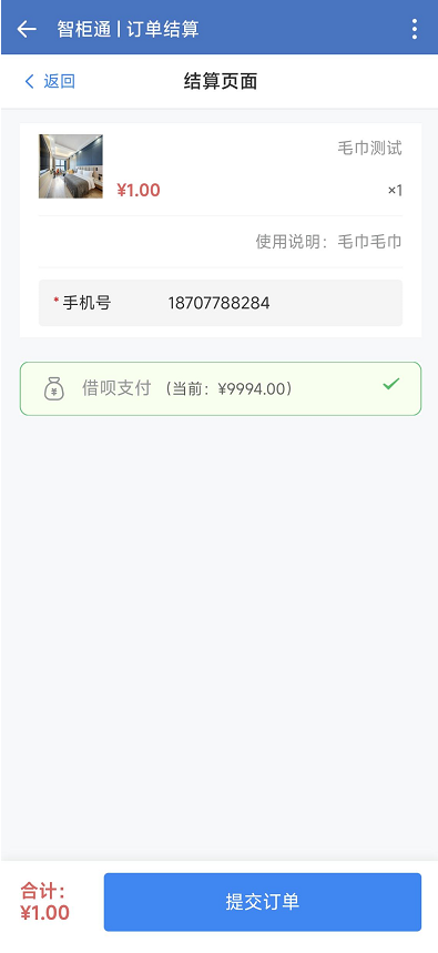 订单提交(依赖借呗余额:提前确认余额) 进入结算页面,系统会显示 “已选物品清单”(含物品名称、物品价格、物品使用说明、数量、领用人手机号) 确认物品清单无误后,点击【提交订单】,系统弹出 “支付成功” 提示,点击确认进入 “支付成功页面”。文档更新时间: 2025-12-09 16:56 作者:韦绍杰