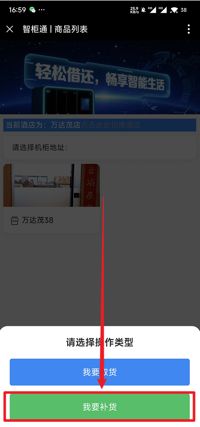 目录 搜索 前言正文应用入口身份认证核心操作明细手机端取货操作明细选择酒店操作方式选择机柜地址选择对应柜子选择需取用物品订单提交取用商品查看订单详情手机端补货操作明细选择酒店操作方式机柜管理选择柜子补充商品 暂无相关搜索结果! 本文档使用 MinDoc 发布 操作方式 选择操作方式选择好酒店后,还需要选择我要补货操作类型。操作类型说明如下: 我要补货此操作类型下,用户可以选择机柜进行补货。文档更新时间: 2025-12-09 17:03 作者:韦绍杰